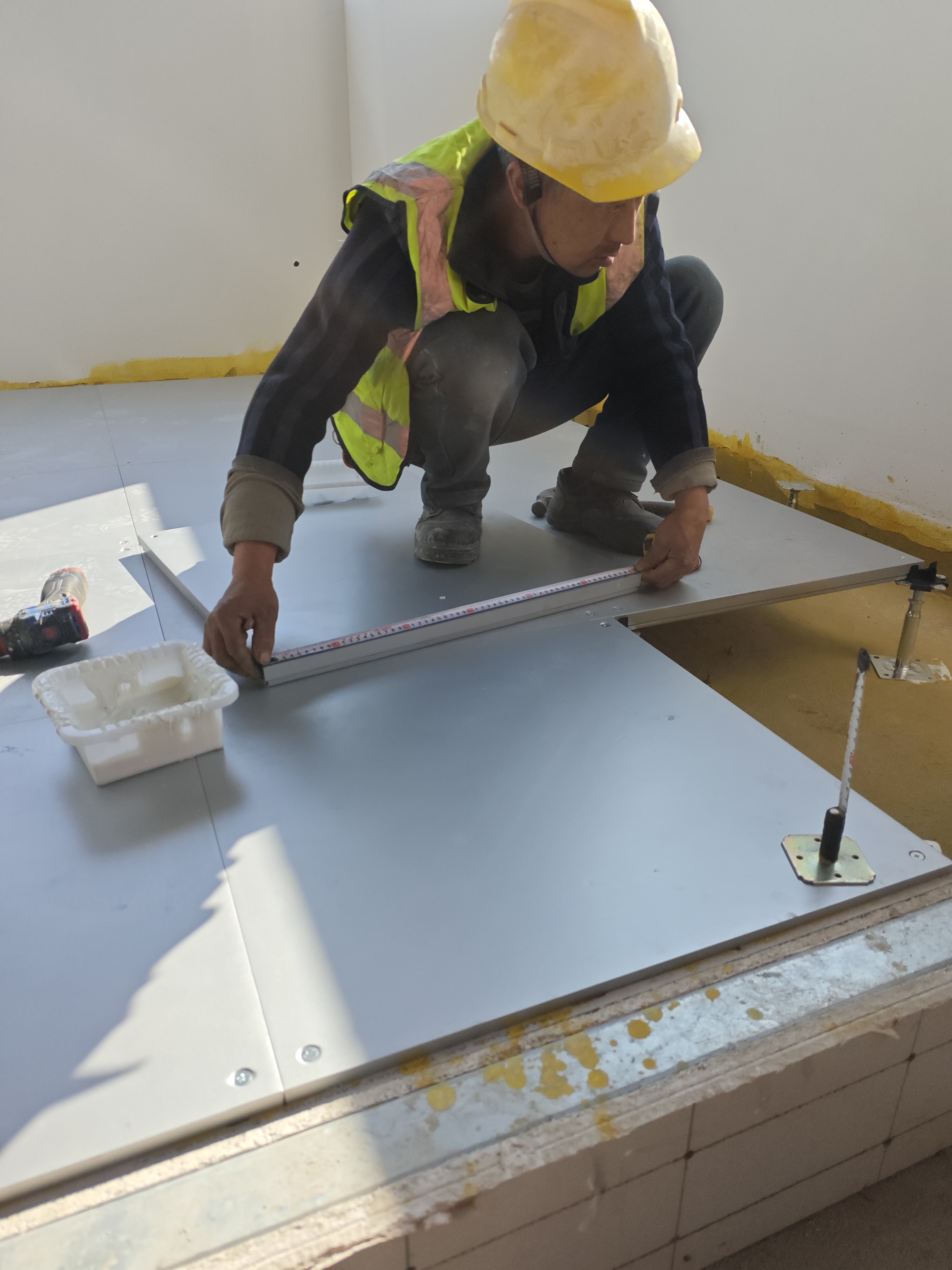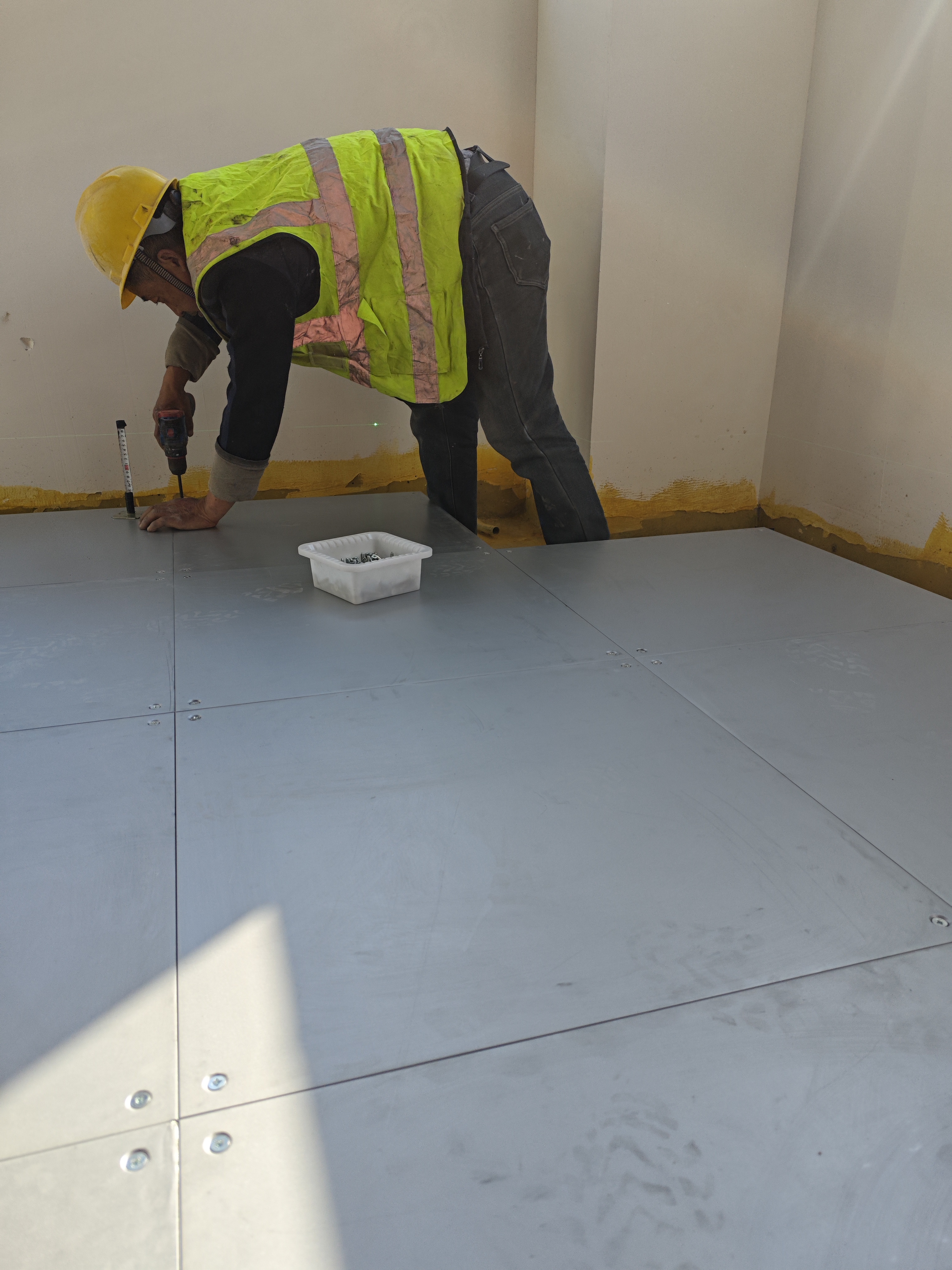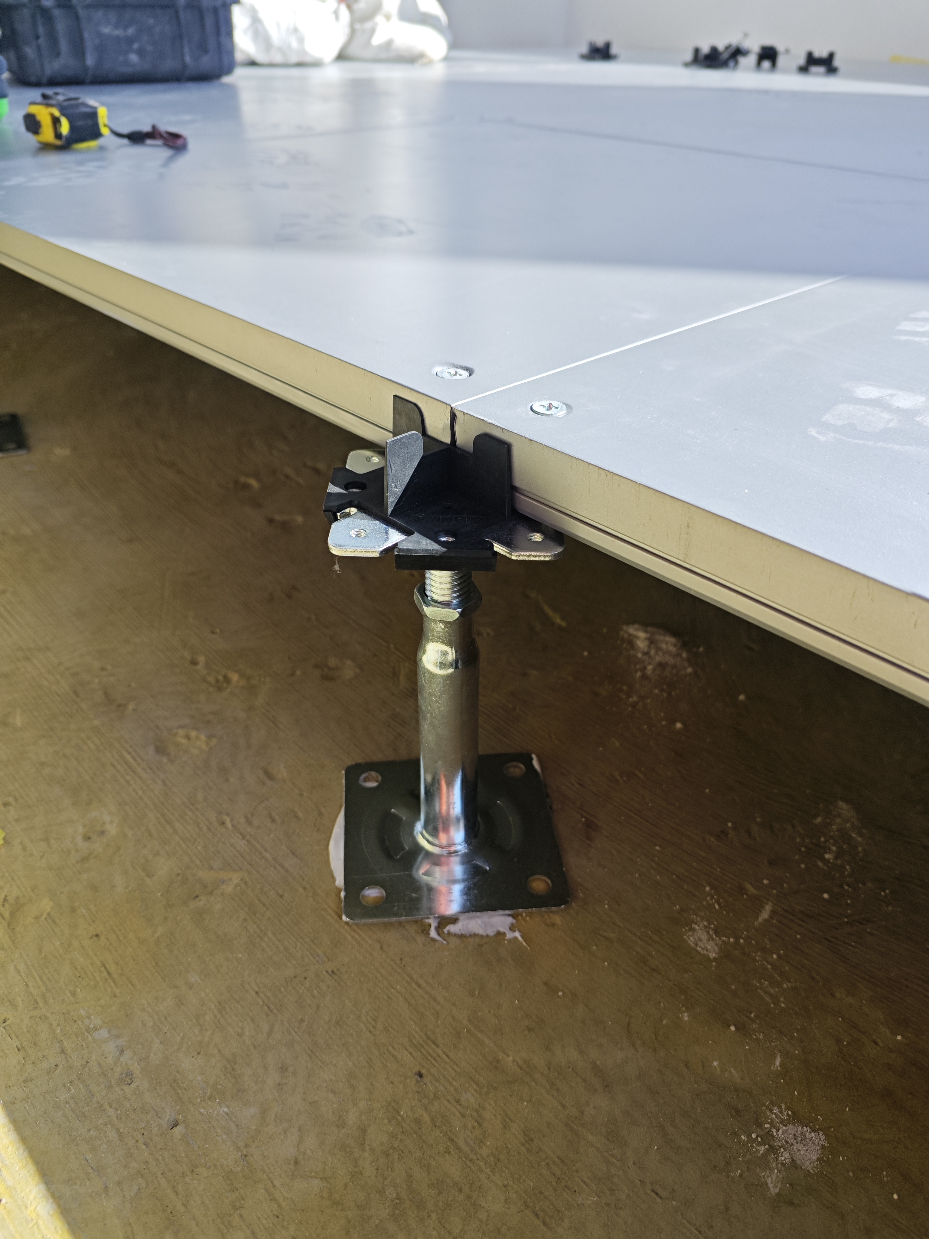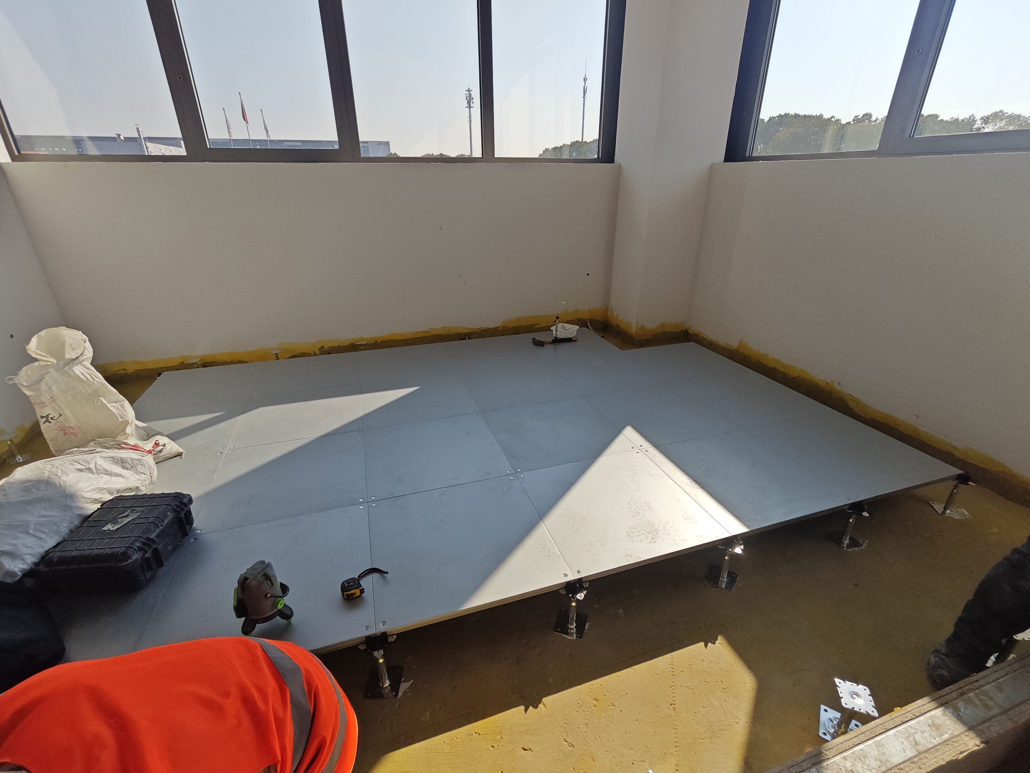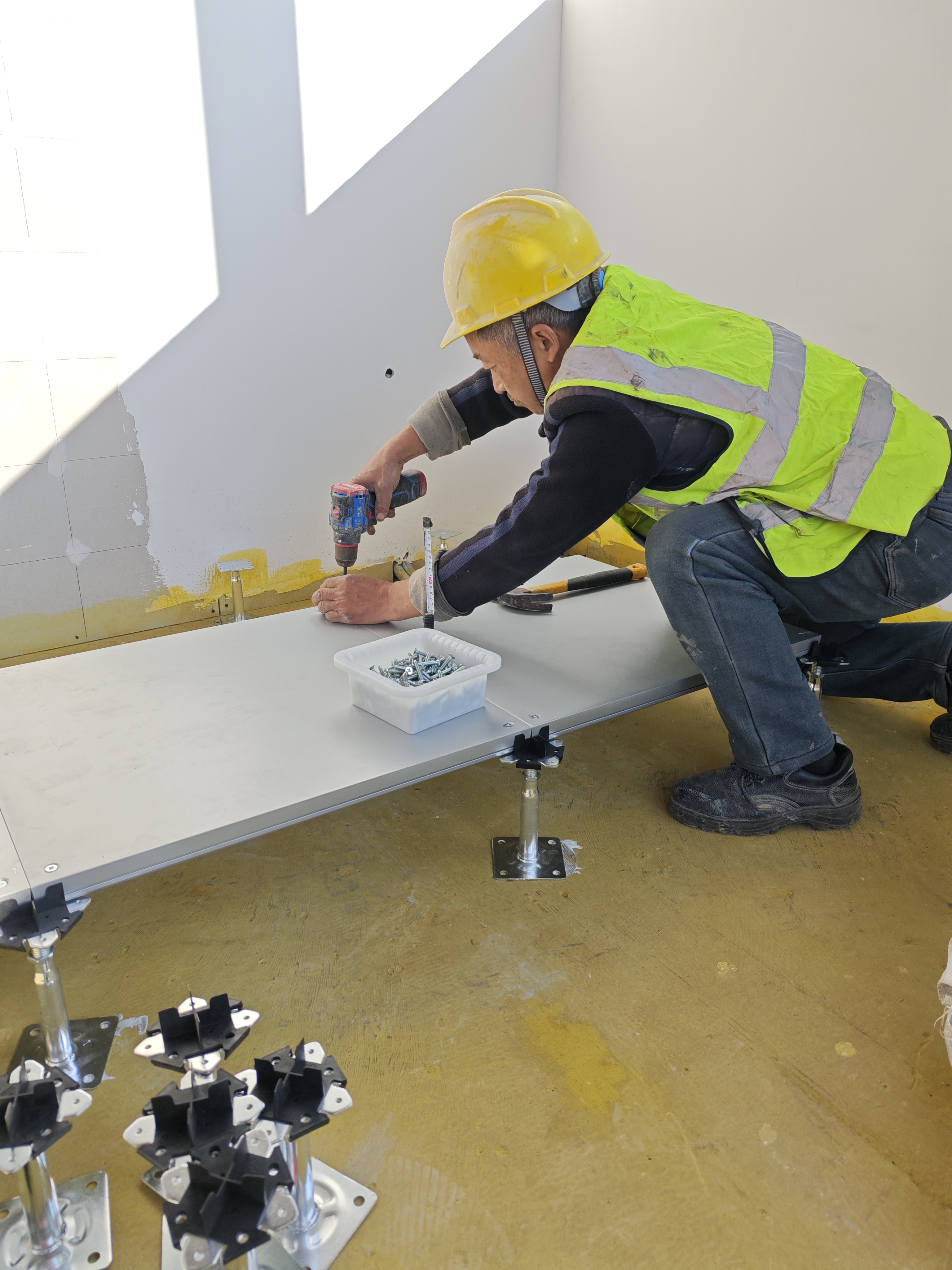 - 標(biāo)準(zhǔn)化安裝:架空地板定點(diǎn)定位,支架逐點(diǎn)定膠精確施工。安裝順序由中心至四周逐步推進(jìn),四角異形區(qū)域按實(shí)地精細(xì)裁切,與主體結(jié)構(gòu)嚴(yán)密貼合。